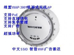 WAP-3001是一款吸顶式无线AP(接入点) ,运行频段为2.4GHz。采用MIMO、OFDM等技术,最高可提供300Mbps的无线数据传输速率。采用多PA功率放大器设计,内置高增益天线,10倍无线信号超强放大,轻松穿透多面阻隔墙,覆盖面积高达4000平方米以上。采用独特集中管理平台,可有效实现对设备统一管控,让维护操作更加简单、快捷。设备人性化吸顶式设计,美观大方,可直接安装在墙壁和天花板上。支持标准POE供电及外置电源供电双模式,可满足不同的环境应用需求。