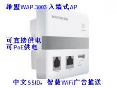 WAP-3003是一款入墙式无线AP(接入点) ,运行频段为2.4GHz,采用国际无线标准设计,可将有线网络分解成有线及无线WiFi信号等多应用方式,方便各类智能终端实现无线WiFi上网。本设备可广泛安装在墙体86面板的线盒上,不破坏原有的装修,安装简单,可管理性强。 国际无线标准设计,符合绿色环保理念,可广泛用于酒店客房、KTV包间、学校宿舍、医院病房等场所。
