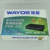 FBM-220是维盟科技针对小型网吧、企业而设计的突出行为管理功能的双WAN多功能上网行为智能路由器。采用高效能多NP网络专用处理器,运算速率高达384MHZ,支持80,00个联机数,标准带机30台以内。该设备具有32M高速内存,长时间高负载运作稳定可靠。支持2个广域网络WAN端口、3个局域网LAN端口,采用WayOS动态智能带宽管理功能,只需设置好您实际带宽,就可以轻松解决BT、迅雷、 电驴、QQ直播等P2P占用带宽问题。具备强效防火墙功